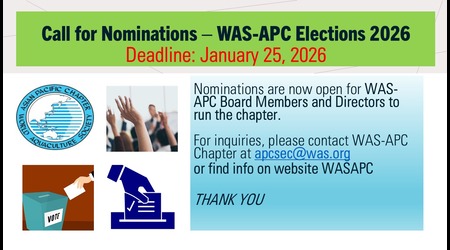 January 2026 – The World Aquaculture Society – Asia Pacific Chapter (WAS-APC) is pleased to announce a call for nominations for key leadership positions for the upcoming term. Nominations are now open for President-Elect, Treasurer, two Directors, an...