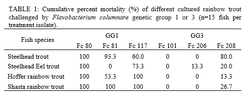 Flavobacterium columnare is a filamentous Gram-negative bacterium responsible for significant economic losses in several freshwater fish and a re-emerging pathogen for wild and cultured salmonids in the US Pacific Northwest. Flavobacterium columnare strains have been assigned into four different genetic groups (GG) likely representing different bacterial species with some fish-host association. This study evaluated the susceptibility of four different rainbow trout (Oncorhynchus mykiss) strains cultured in California to three isolates typed in F. columnare GGs 1 and 3, the two more prevalent genetic groups affecting salmonids worldwide. The rainbow trout strains investigated are either native trout strains to California raised for conservation purposes, hatchery hybrid trout raised for sport fisheries or are imported strains selected for disease resistance or fast growth phenotypes. Virulence was determined through immersion challenges in two different strains of Steelhead trout, the Hoffer strain rainbow trout and the Shasta strain rainbow trout at 18°C. Central valley strain Steelhead trout, Eel river strain Steelhead trout, Hofer rainbow trout and Shasta strain rainbow trout challenged with GG1, presented a cumulative percent mortality (CPM) of 60-100%, 0-100%, 53.3-100%, and 100%, respectively. On the other hand, central valley strain Steelhead trout, Eel river strain Steelhead trout, Hofer rainbow trout and Shasta strain rainbow trout challenged with GG3, presented a CPM of 0-80%, 0-20%, 0-13.3%, and 0-26.7%, respectively (Table 1). F. columnare was recovered from gills and posterior kidney of moribund and recently dead fish in exposed treatments. Evaluation of up to 3 survivors in each treatment was performed to determine carrier status in gills and posterior kidney. The prevalence of F. columnare in survivors was 0% in both gills and posterior kidney of all challenged and control groups. The results suggest similar susceptibility to columnaris diseases in all strains of trout evaluated, and confirms GG1 greater virulence to trout when compared to GG3 isolates.