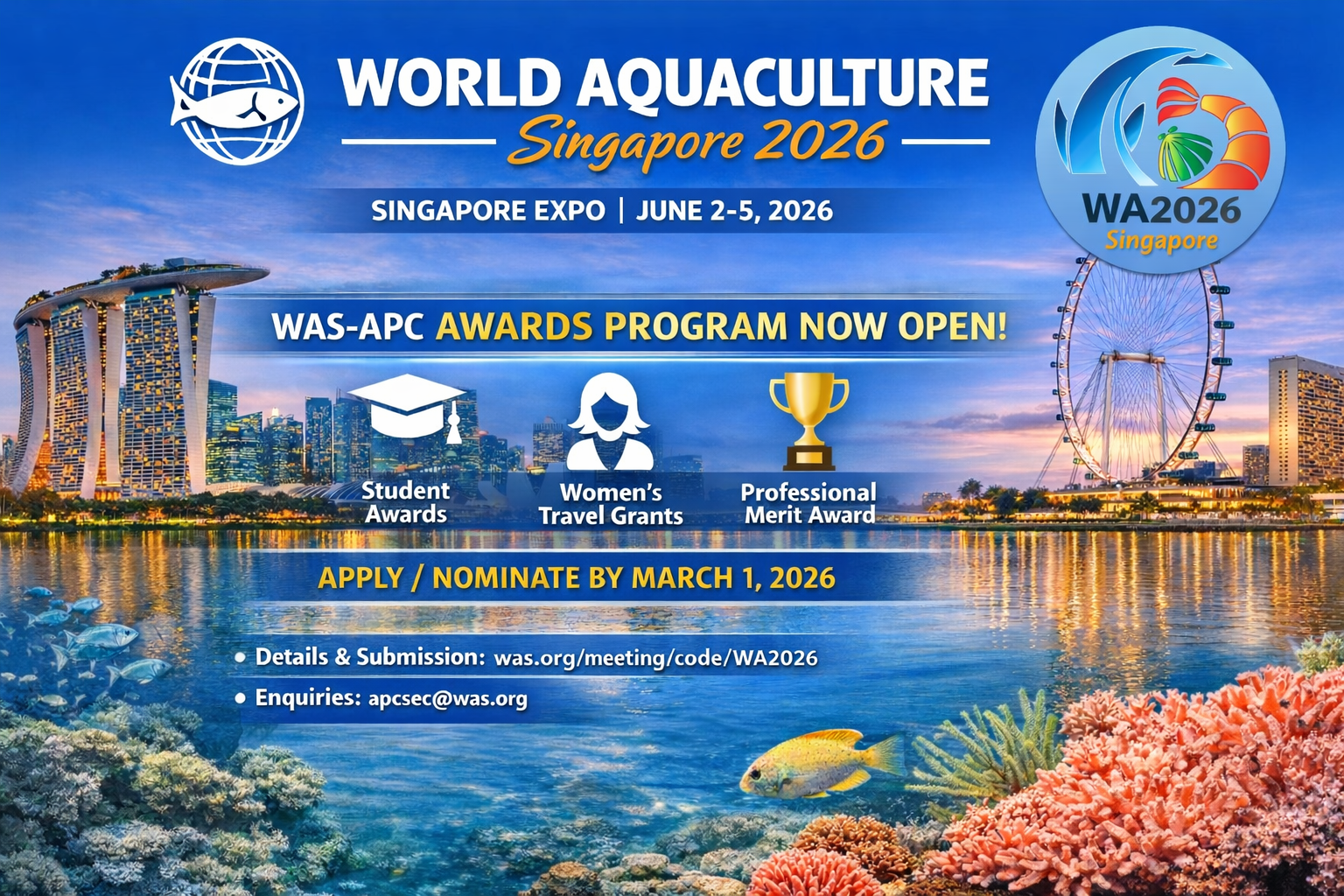 The World Aquaculture Society – Asian Pacific Chapter (WAS-APC) is excited to announce the awards program for World Aquaculture Singapore 2026 (WA2026). The awards aim to recognise and support excellence in aquaculture research, innovation, and e...