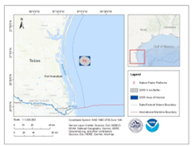 A regional geospatial analysis was conducted in ArcGIS using NOAA's AquaMapper geodatabase . Station Padre is located 35 miles NE of Port Mansfield, TX at a water depth of 155 ft. Temperature ranged from 18- 29 °C, salinity maintained at 35 ppt, and dissolved oxygen > 4.7 mg l-1 . Mean current ranged from 0.05 - 0.2 sv with a m aximum current of 0.75 sv and mean wave height of 1.3 m. Wave energy period, wind direction, light attenuation, nutrient profiles, and benthic composition were also assessed. Station Padre is located within a Military Operating Area, which covers an extensive portion (30,000 sq. km) of the northwest GOM. Additionally, platforms are located 80 and 215 m from a shipping fairway, which transects the Area of Interest . Shipwrecks, artificial reefs, and hard bottom habitat are located no closer than 6.6 km from the platforms. Site characterization revealed favorable conditions and it was determined that 77% of the Area of Interest represents Opportunity Area for future farm development.